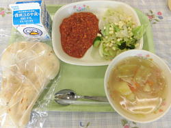 『牛乳、ナンのチリミートソース、チーズサラダ、ポトフ』
