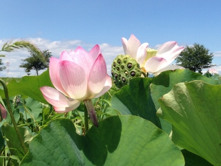 飛行を楽しんでいます。青淵公園では、猛暑さに負けず、向日葵や蓮の花が