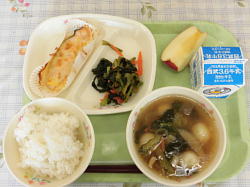 『牛乳、ご飯、鮭のマヨコーン焼き、煮浸し、だまっこ鍋』