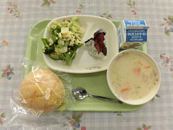 『牛乳、メロンパン、チーズサラダ、コーンスープ』