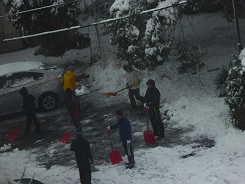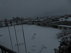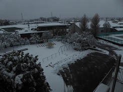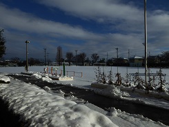 校庭は一面の銀世界 午後の晴れ間でだいぶしっとり