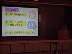 校長先生の講話です。プレゼンを使用し、3つの大切なことを学びました。