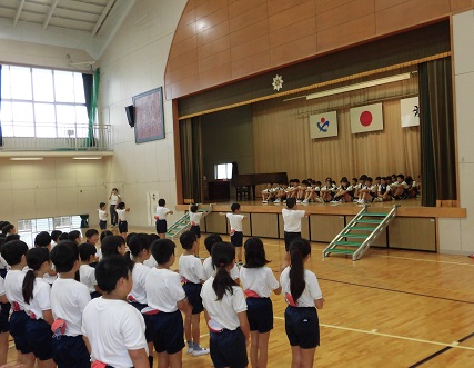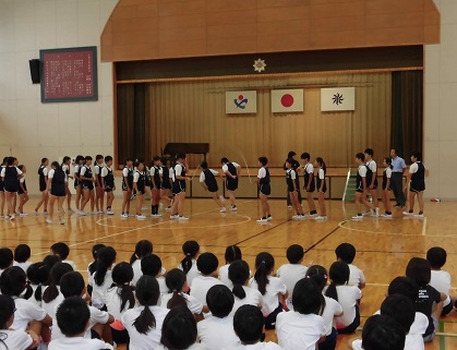今朝、全校で親善運動会の激励会が行われました。