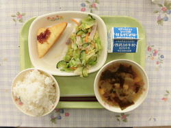 『牛乳、ご飯、チーズハンペンフライ、セサミサラダ、味噌汁』
