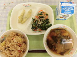 『牛乳、秋の香りご飯、ワカサギフリッタ-、ほうれん草のごま和え、味噌汁』