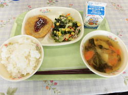 『牛乳、ご飯、ハムカツ、ほうれん草のソテー、味噌汁』