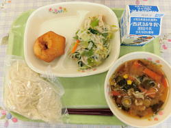 『牛乳、道産子風味噌ラーメン、、玉子ドーナッツ、深谷ネギのナムル』