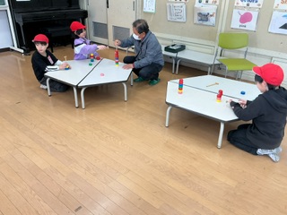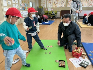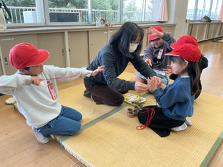 おはじきやメンコ、お手玉、だるま落ちし、あやとりの遊び方を教えていただきました。