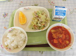 『牛乳、ご飯、肉じゃがのトマト煮、たくわんサラダ、オレンジ』