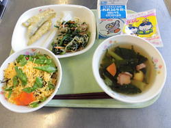 『牛乳、ちらし寿司、わかさぎのフリッター、ほうれん草のごま和え、すまし汁』