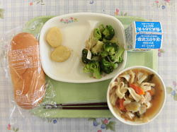 『牛乳、バターロール、煮ぼうとう、エビナゲット、ブロッコリーサラダ』