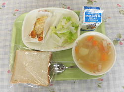 『牛乳、食パン、チキンの香味焼き、カントリーサラダ、コンソメスープ』