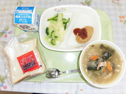 『牛乳、食パン、イチゴジャム、コーンコロッケ、グリーンサラダ、オニオンスープ』