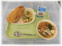 「牛乳、きなこあげパン、大根とハムのサラダ、ワンタンスープ」