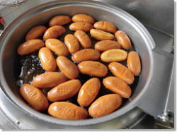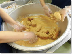 きな粉、砂糖と少しの塩を混ぜた粉を揚がったパンに1つずつ丁寧にまぶします。