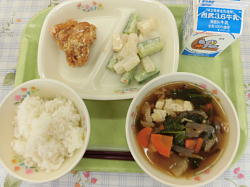 『牛乳、ご飯、鶏の唐揚げ、スティック野菜、けんちん汁』