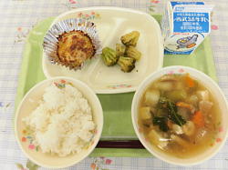 『牛乳、ご飯、鶏肉のマスタード焼き、ブロッコリーのピリット漬け、冬瓜のスープ』