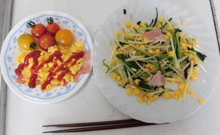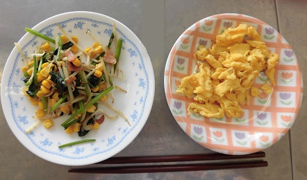 各班で協力しながら、野菜炒めと卵料理を作りました。