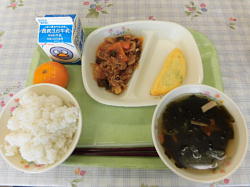 『牛乳、ご飯、豚肉となすのチリソース煮、ほうれん草チーズオムレツ、わかめスープ、冷凍ミカン』
