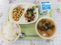 『牛乳、ソイ丼、ほうれん草のサラダ、大根の味噌汁』