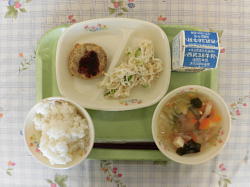 『牛乳、ご飯、メンチカツ、シャキシャキホワイトサラダ、豆腐と野菜のコンソメスープ』