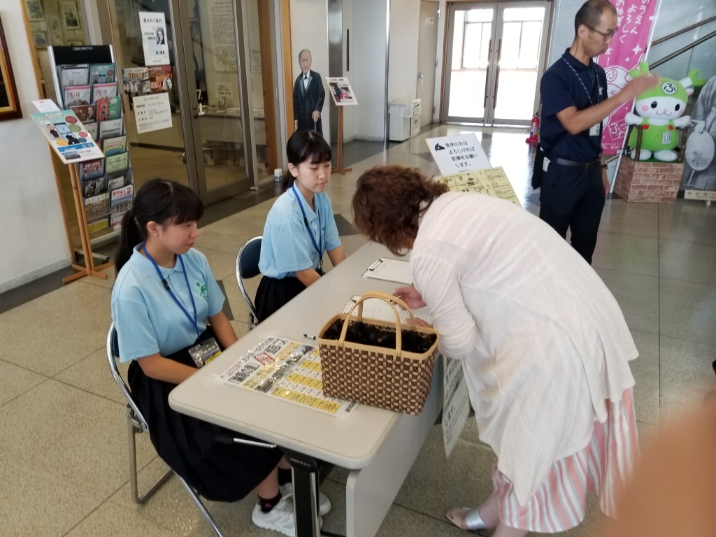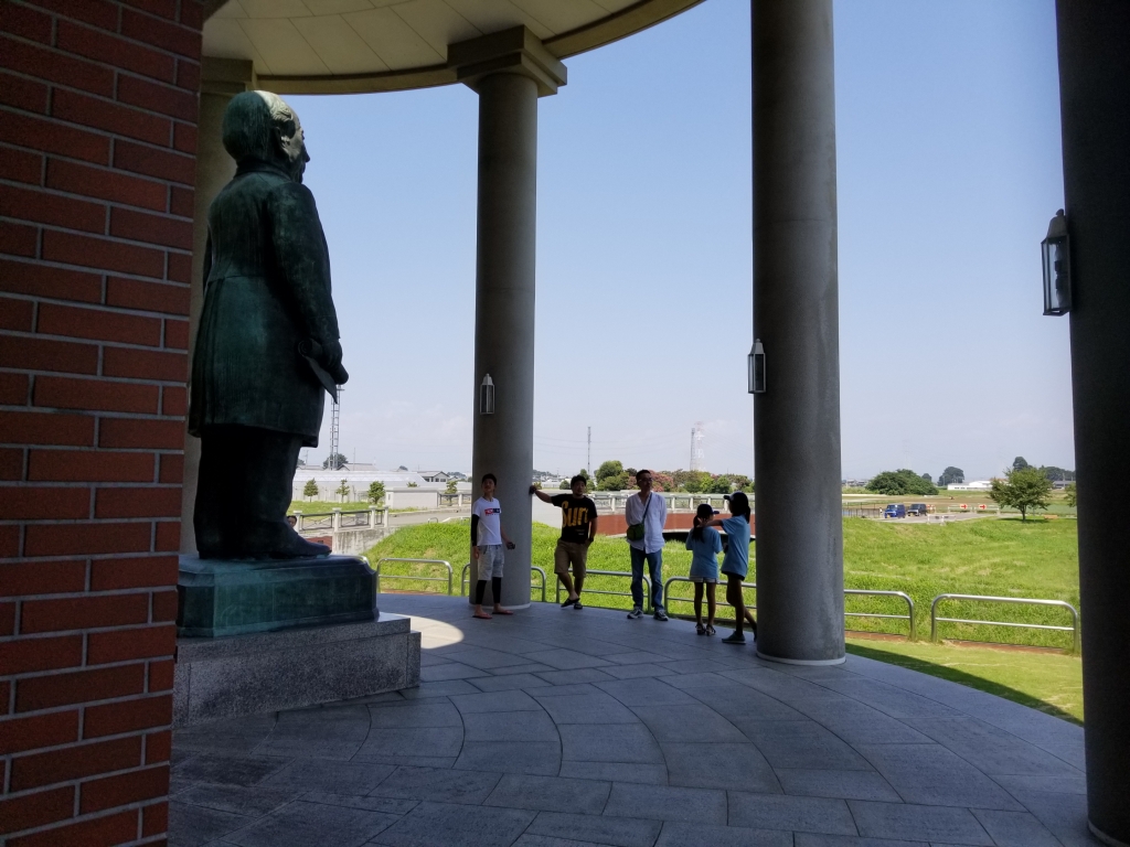豊里中学校生徒が受付をしました。 赤城山を見て立つ栄一翁の像の説明をしました。