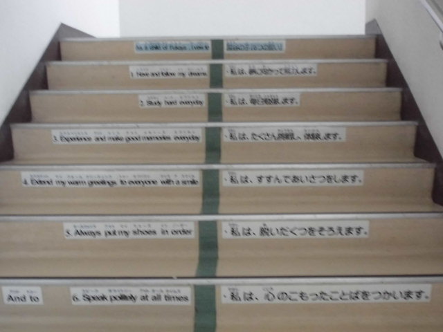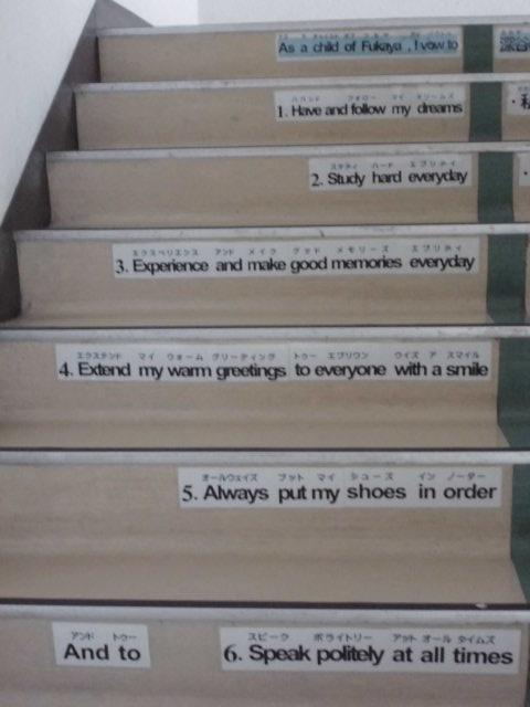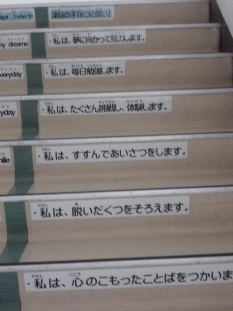 八基小学校では、階段にも、6つの誓いを掲示し、