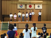 表彰朝会の様子です。「硬筆展」「歯と口の健康週間」「林間学校模範校」の表彰でした。