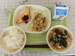 『牛乳、ご飯、チーズはんぺんフライ、野菜炒め、味噌汁』