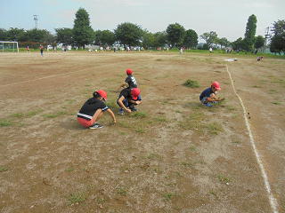 朝の活動の時間に全校で校庭の草むしりを行いました。