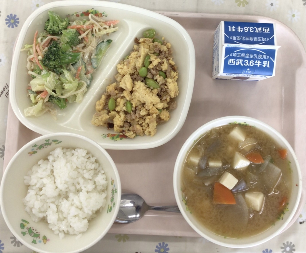 鶏そぼろの茶色、炒り卵の黄色、枝豆の緑です。