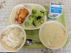 『牛乳、ご飯、チキンのフレーク焼き、カントリーサラダ、ジャガイモのポタージュ』