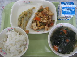『牛乳、ご飯、筍と厚揚げの煮物、子持ちししゃもフリッター、中華スープ』