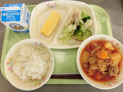 『牛乳、ご飯、肉じゃがのトマト煮、花野菜のサラダ、厚焼き卵』