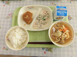 『牛乳、ご飯、豆腐入りつくね、上州サラダ、するが汁』