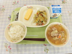 『牛乳、野菜炒め、厚焼き卵、ふりかけ、スタミナ汁』