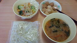 『牛乳、ゴマ味噌ラーメン、白玉団子の黄粉和え、ブロッコリーサラダ』