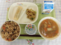 今日は、茶飯にひじきや野菜、鶏肉、大豆がたっぷり入った混ぜごはんです