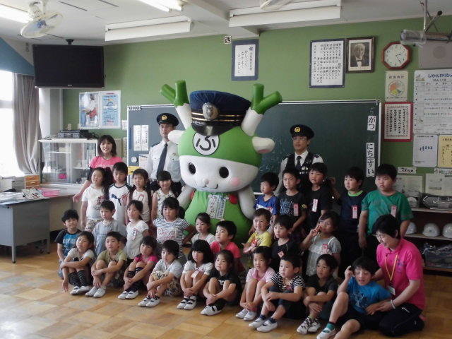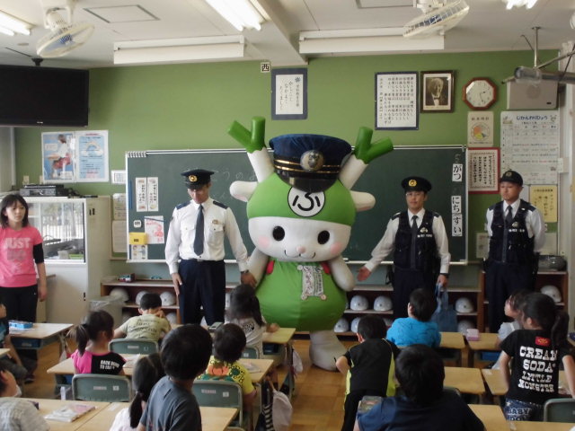 交通安全キャンペーンとして、1年生の教室にふっかちゃんが登場しました。