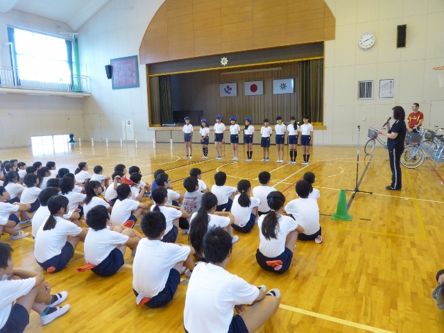 全校児童の前で「S字」と「2枚板」の演技を、一人一人順番に披露してくれました。