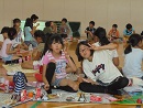 クラスごとに輪になって、唐揚げ、ペペロンチーノなど、おいしい給食に舌鼓。
