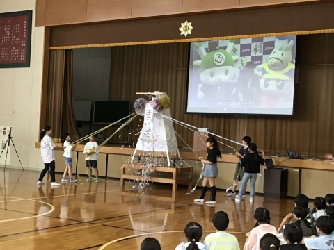 本日、渋沢栄一翁が新一万円札の顔になる記念を祝って、全校で「お祝い集会」を行いました。各学年で工夫を凝らしたくす玉を披露しました。最後には、全校でカウントダウンをして、児童会が作ったくす玉をわりました。どの学年もすてきなくす玉で、大きな拍手がわきました。みんなで、最高のお祝いができました。