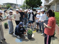 6年生が学校応援団の方に教えていただきながら、フウリン草の支柱立てをしました。