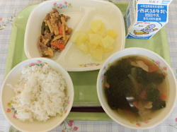 『牛乳、ご飯、チンジャオロースー、パイン、中華スープ』