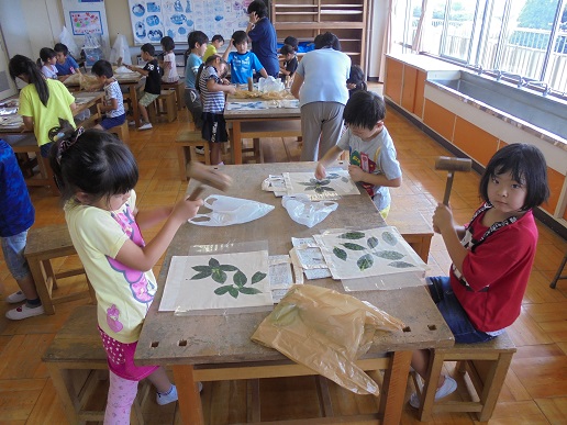 7月17日に1年生が藍のたたき染めをしました。それぞれ個性溢れるデザインのバッグができあがり、みんな大喜びでした。藍の小さな葉っぱからこんなに素敵な色と模様が現れることに驚き、感心したひとときでした。