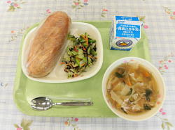 『牛乳、きな粉揚げパン、ツナとひじきのサラダ、ワンタンスープ』