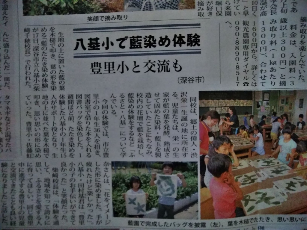 豊里小の1年生と交流した藍のたたき染めの記事が