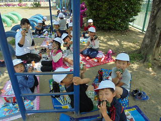 天候が心配されましたが、給食の時間になるに連れて青空が広がり、外で給食を食べることができました。