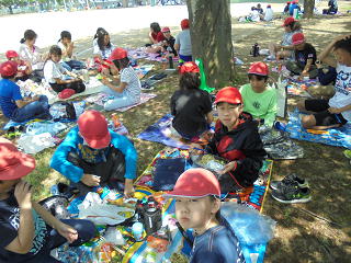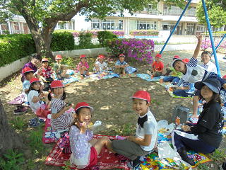 各学年、和やかな雰囲気で青空給食を楽しんでいました。
