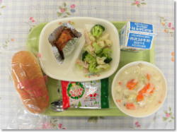 ソフトフランスパン、タンドリーチキン、花野菜のサラダ、きのこのクリームシチュー、ワッフル、牛乳』